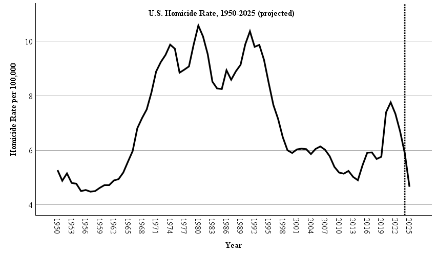 In the figure below, you can examine the homicide trend from 1950 to 2025 with this year’s data projected using monthly city data (indicated with the vertical line). The precipitous murder decline has shown no signs of letting up and will likely continue to sink even lower in the coming years.