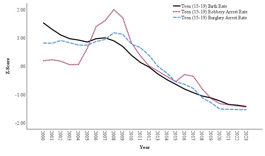 The 2000-2019 arrest statistics are from annual Uniform Crime Reports compiled by the FBI. The 2020 through 2023 statistics were derived from the Crime Data Explorer website. The 2021 and 2022 data are linear interpolated as missingness during those years of transition between the UCR and NIBRS systems is apparent. The teen birth data is from the CDC, standardized by 1,000 population of females aged 15 to 19.