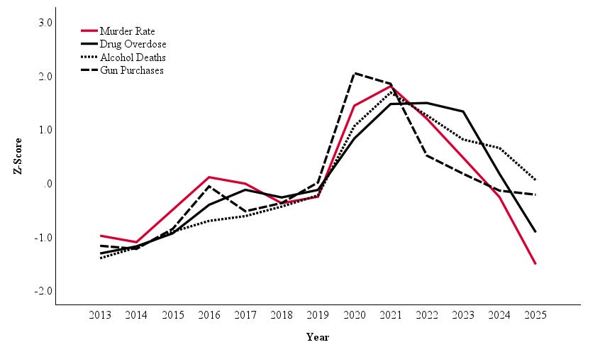 Below, I display an updated figure of the standardized trends in drug overdose deaths, alcohol consumption-related deaths, firearm sales, and the homicide rate. I extend these estimates into 2025 by extrapolating from early monthly data from this year.9 As is apparent, these trends have closely followed each other since the early fentanyl epidemic, circa 2013.