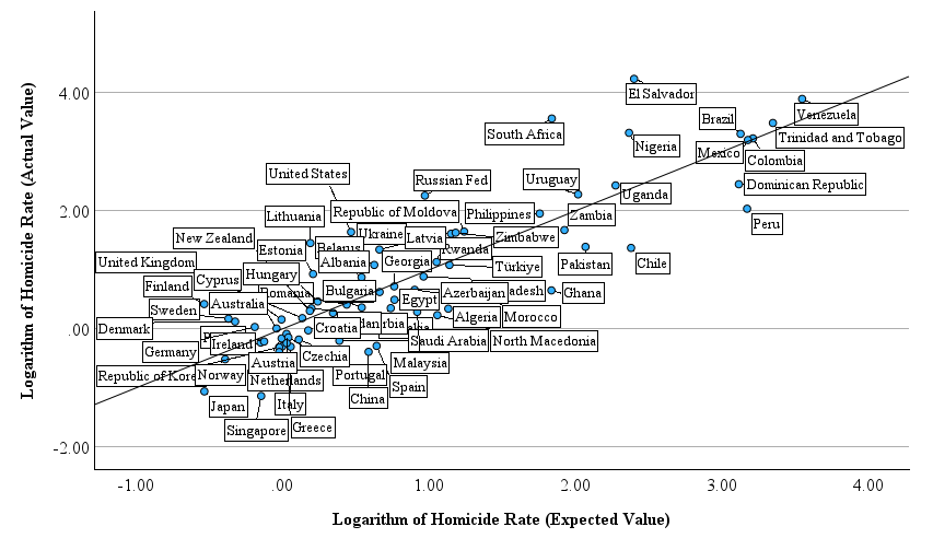 We don’t have very good international data for overall crime rates, but murder rate comparisons are common. Below, I examined a variation in homicide rates (converted to a logarithm). After accounting for a few relevant factors, we can see that homicide rates in the United States are a bit higher (actual value) than we would expect (expected/predicted value). Nations that are close to the U.S. in predicted/expected values are often located in Eastern Europe (Hungary, Bulgaria, Georgia, etc.). This would suggest our homicide rate could come down below 3 per 100,000, depending upon which nation is selected as comparison.10