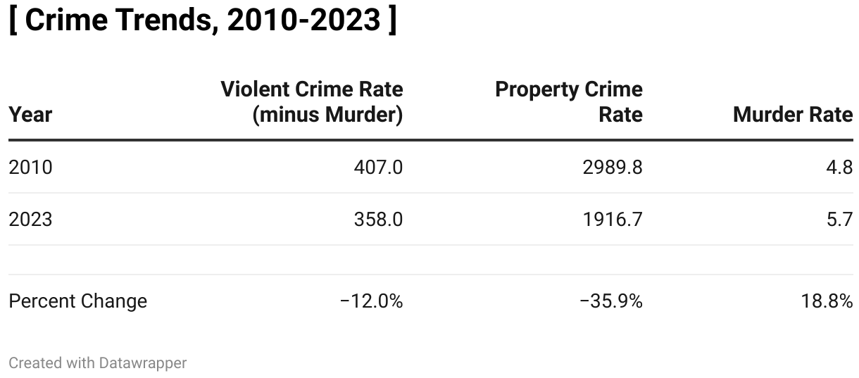 To begin, I will address why crime rates, other than homicide, have largely been declining. In the table below, I display the crime trends from 2010 to the latest year of available (national) data, 2023. Property crime has been in freefall and violent crime has declined significantly. However, as we will see, the muder rate took a slightly different path.