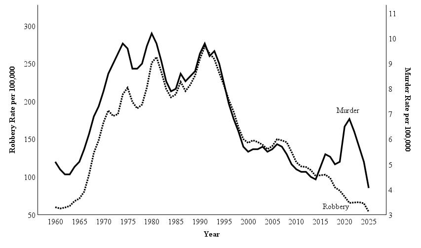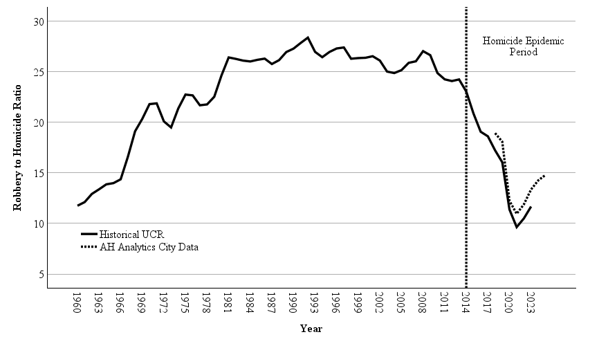 In the figure below, I display the robbery to homicide ratio from 1960 to 2023. In this figure, I also extend this data to 2025 using AH Analytics city data. While the robbery to murder ratio was nearly as low in the 1960s as it is today, I attribute this to missing and incomplete data during early eras. From 1974 to 2015, the robbery to murder ratio was always at least 20:1 or greater. From 2015 onward, there was a steep drop, which has rebounded as murder rates have fallen for the past three years. By the end of 2025, the ratio may nearly reach 15:1.