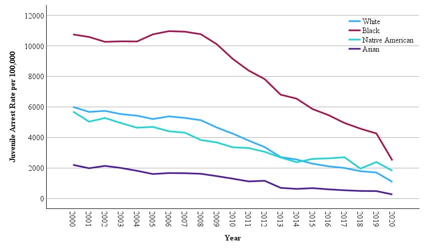 The story of the crime decline needs to start with the decline in youthful offending. Since the late 2000s, there has been a dramatic decline in youth offending. Below, using data from the Office of Juvenile Justice and Delinquency Program, we can see that the rate of juvenile arrests has declined for youth of all races from 2000 through 2020.